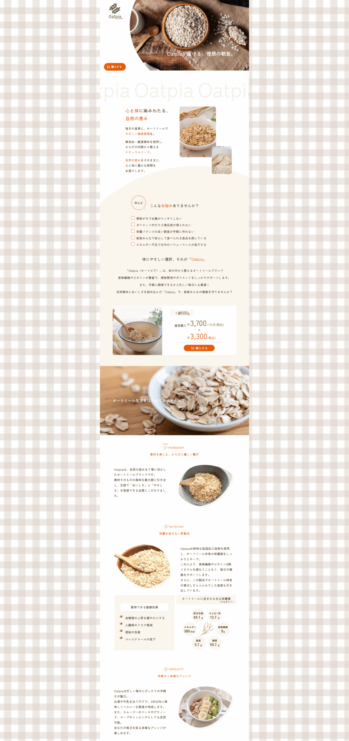 現代風のモダンなLPをイメージして、オートミールをイメージした形やモチーフ、イラストを入れて、温かみがありつつもスッキリしたデザインに仕上げました。
